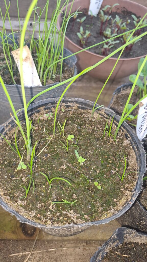 Es muy común pensar que cuanta más agua, mejor. Pero las raíces también necesitan respirar. Si el suelo está siempre encharcado, las raíces se pudren y la planta muere. Es mucho más fácil recuperar una planta que pasó un poquito de sed que una que se pudrió. Mirá la foto y vas a ver como maté un montón de verdeo con exceso de agua e inclusive se ve como se generó el verdín por eso.